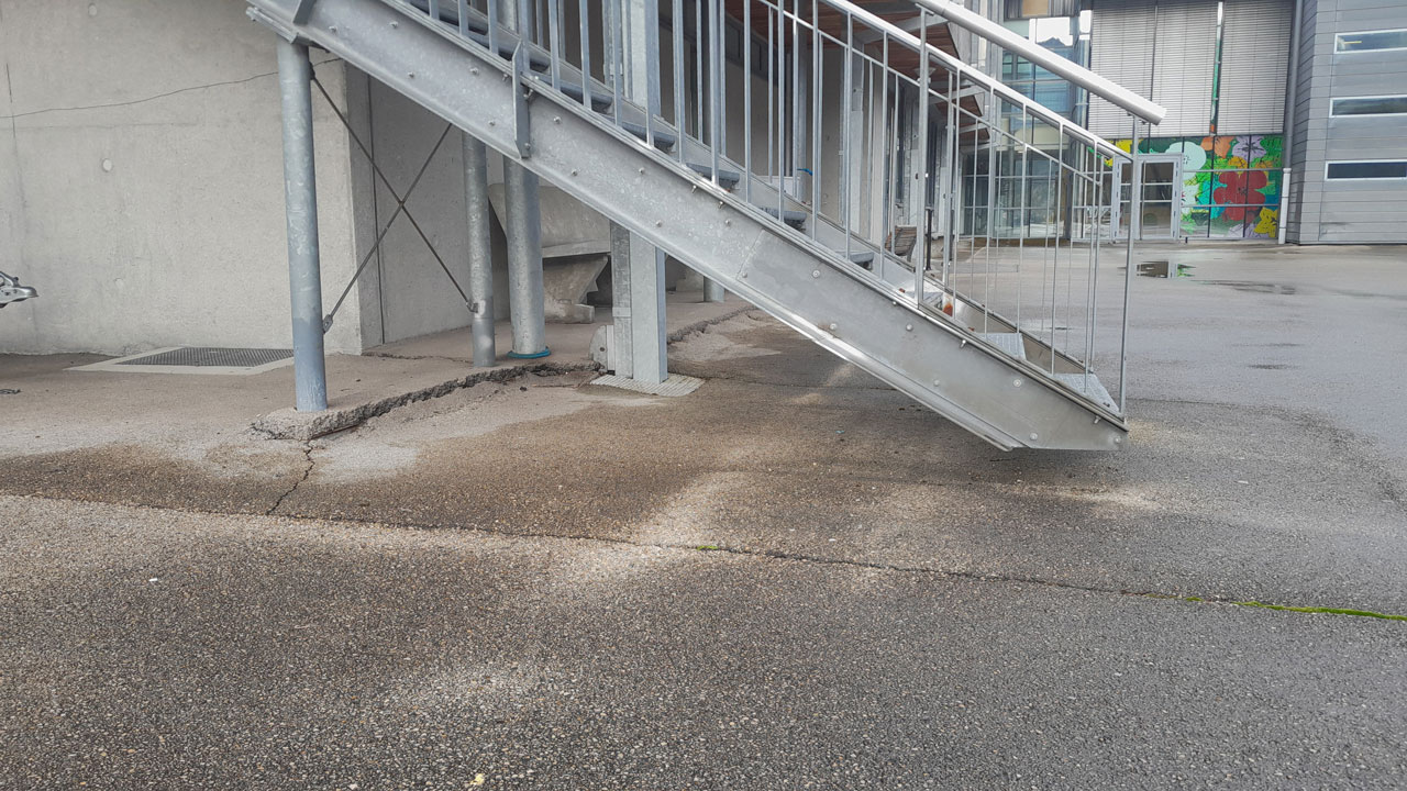 Comme le bâtiment (sur radier caisson) s’est relativement peu enfoncé par rapport aux cours, on peut constater quelques « légers » tassements différentiels inesthétiques et pas très pratiques.